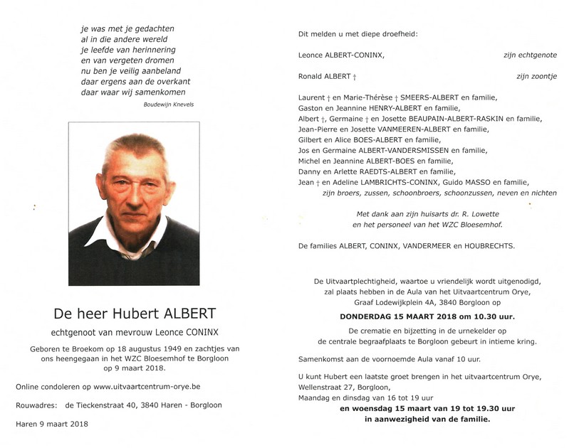 Albert, Hubert, geboren op 18-09-1949 te Broekom, overleden op 09-03-2018 te Borgloon op 68-jarige leeftijd.
