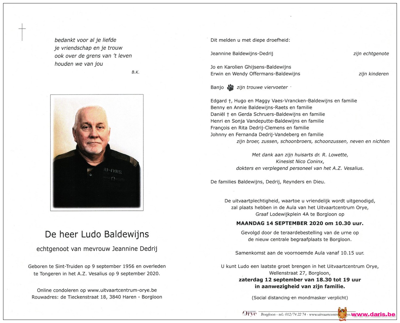Baldewijns, Ludo, geboren op 09-09-1956 te Sint-Truiden, overleden op 09-09-2020 te Tongeren op 64-jarige leeftijd.