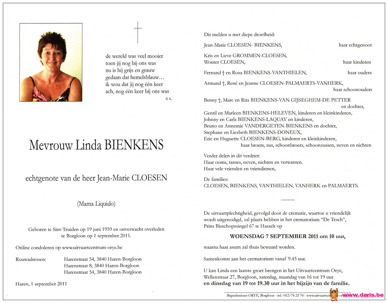 Bienkens, Linda, geboren op 19-06-1959 te Sint-Truiden, overleden op 01-09-2011 te Borgloon op 52-jarige leeftijd.