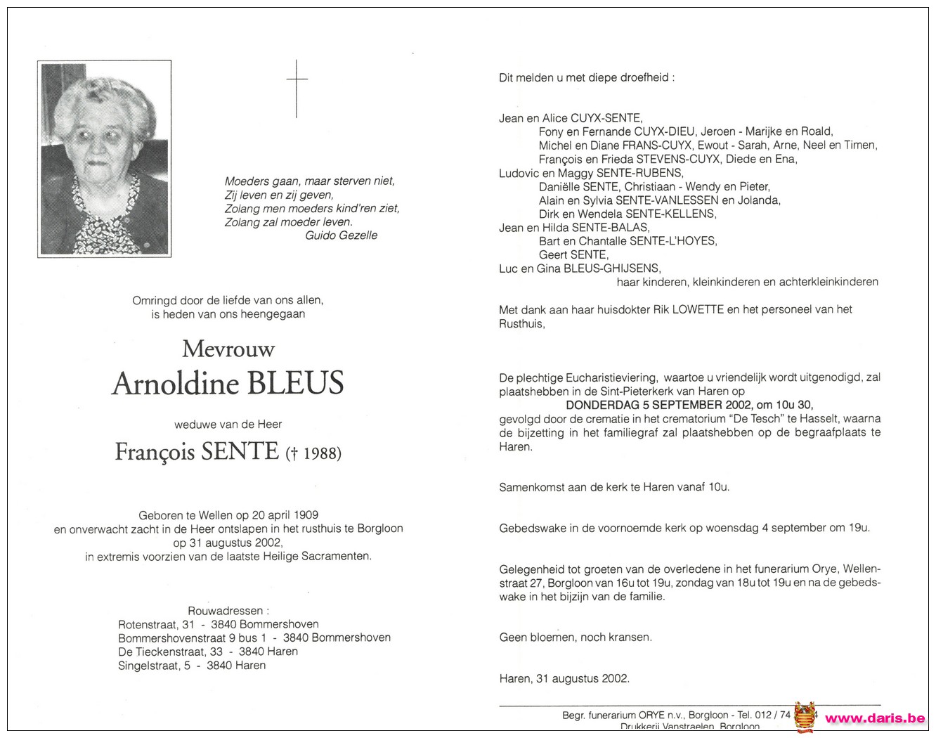 Bleus, Arnoldine, geboren op 20-04-1909 te Wellen, overleden op 31-08-2002 te Borgloon op 93-jarige leeftijd.