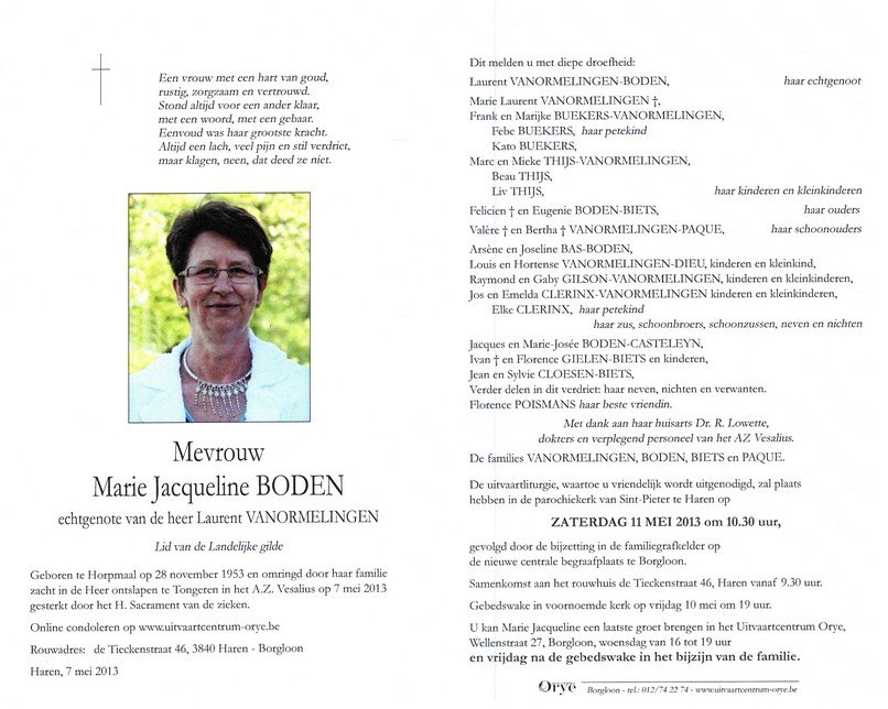 Boden, Marie Jacqueline, geboren op 28-11-1953 te Horpmaal, overleden op 07-05-2013 te Tongeren op 59-jarige leeftijd.