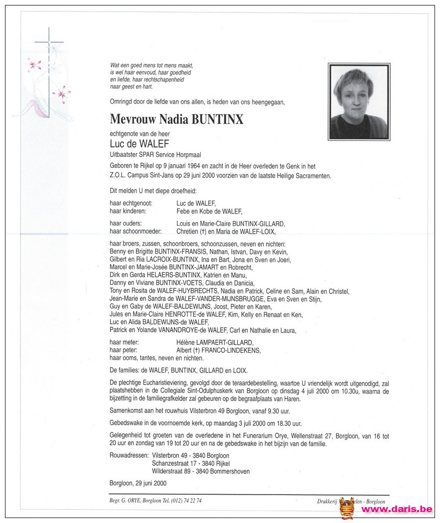 Buntinx, Nadia, geboren op 09-01-1964 te Rijkel, overleden op 29-06-2000 te Genk op 36-jarige leeftijd.