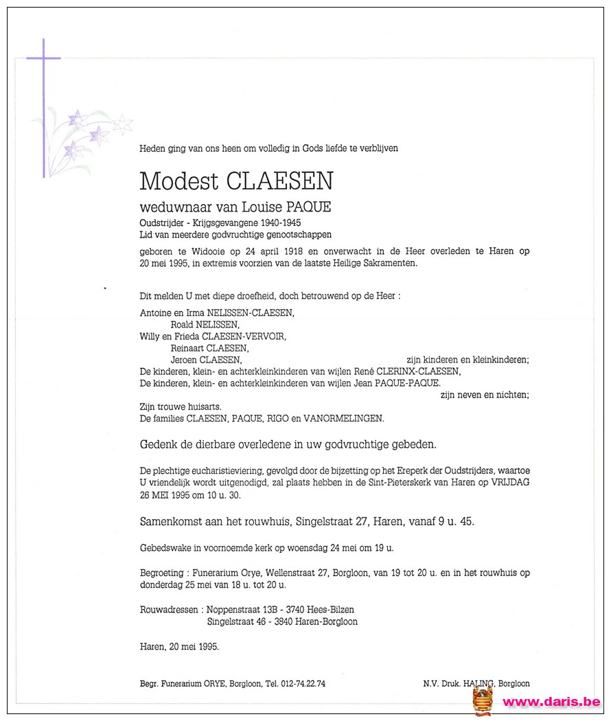 Claesen, Modeste, geboren op 24-04-1918 te Widooie, overleden op 20-05-1995 te Haren op 77-jarige leeftijd.