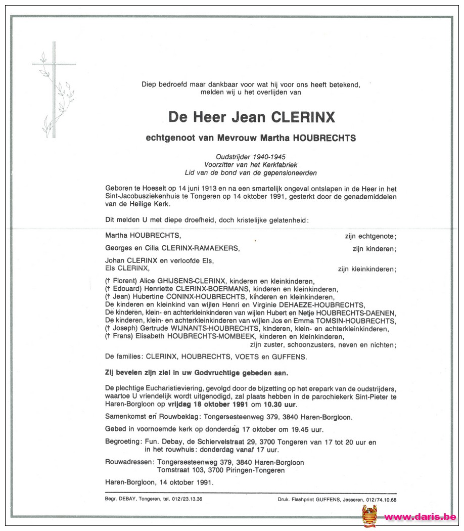 Clerinx, Jean, geboren op 14-06-1913 te Hoeselt, overleden op 14-10-1991 te Tongeren op 78-jarige leeftijd.