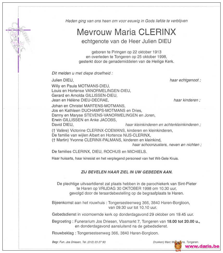 Clerinx, Maria, geboren op 20-10-1913 te Piringen, overleden op 25-10-1998 te Tongeren op 85-jarige leeftijd.