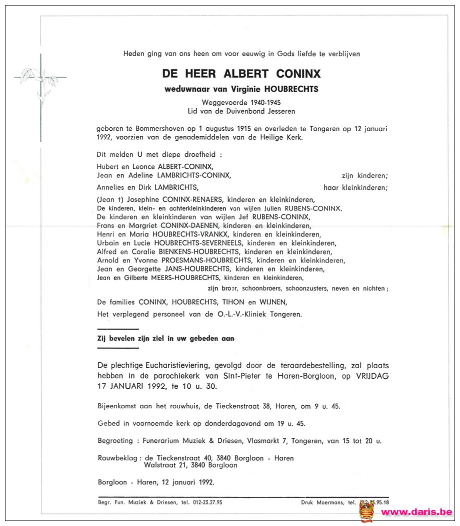 Coninx, Albert, geboren op 01-08-1915 te Bommershoven, overleden op 12-01-1992 te Tongeren op 76-jarige leeftijd.