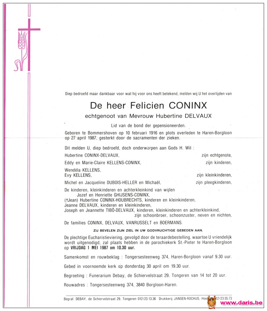 Coninx, Felicien, geboren op 10-02-1916 te Bommershoven, overleden op 27-04-1987 te Haren op 71-jarige leeftijd.