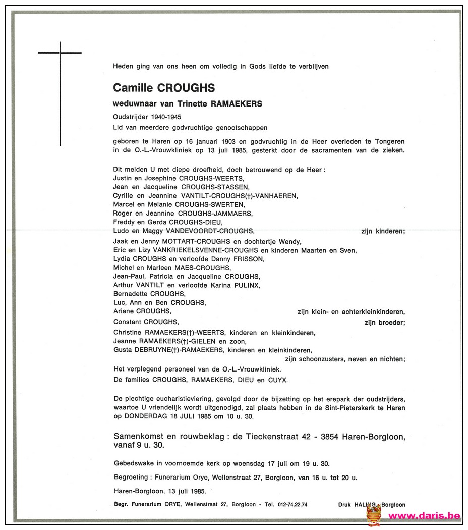 Croughs, Camile, geboren op 16-01-1903 te Bommershoven, overleden op 13-07-1985 te Tongeren op 82-jarige leeftijd.