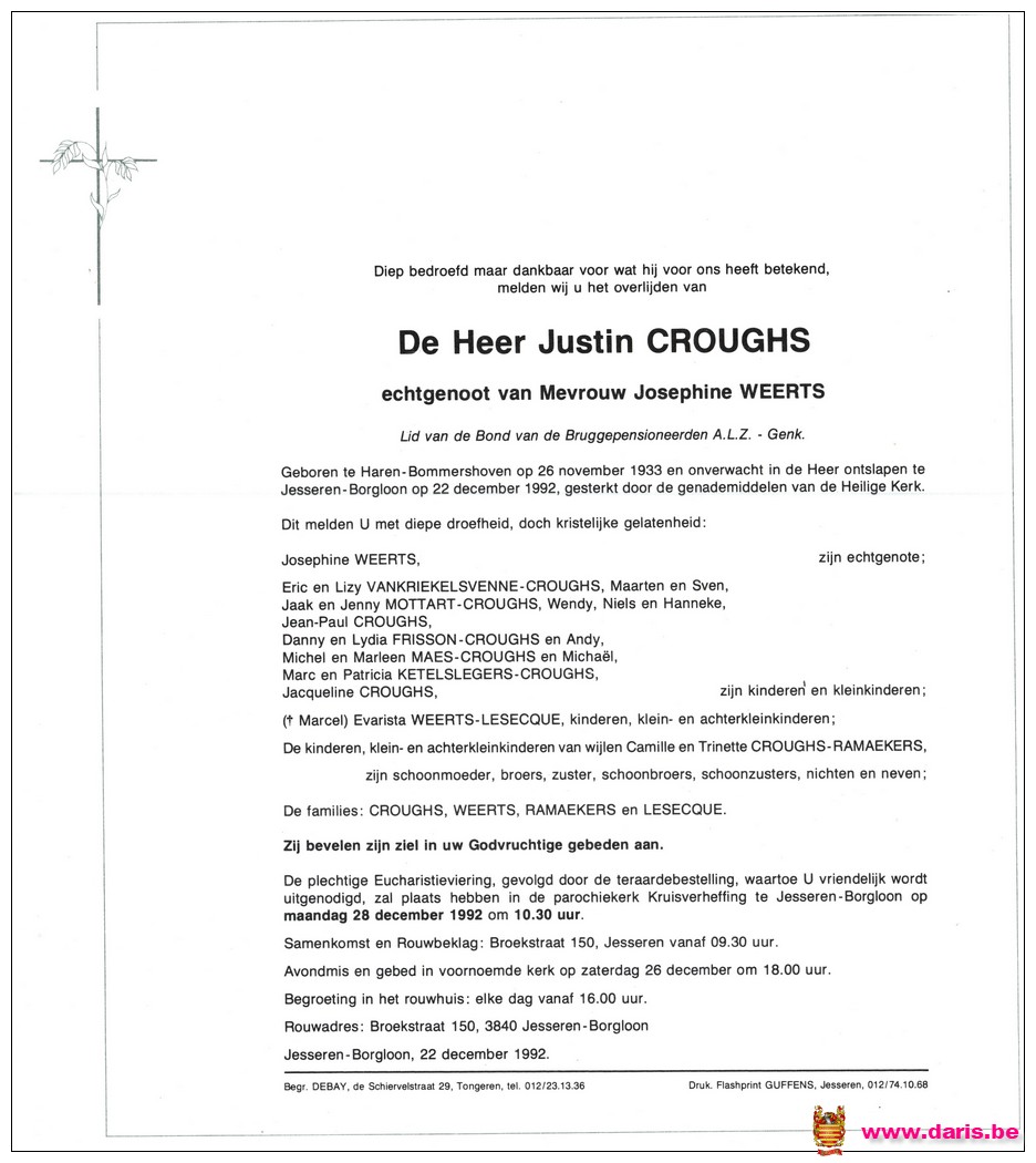 Croughs, Justin, geboren op 26-11-1933 te Bommershoven, overleden op 22-12-1992 te Jesseren op 59-jarige leeftijd.