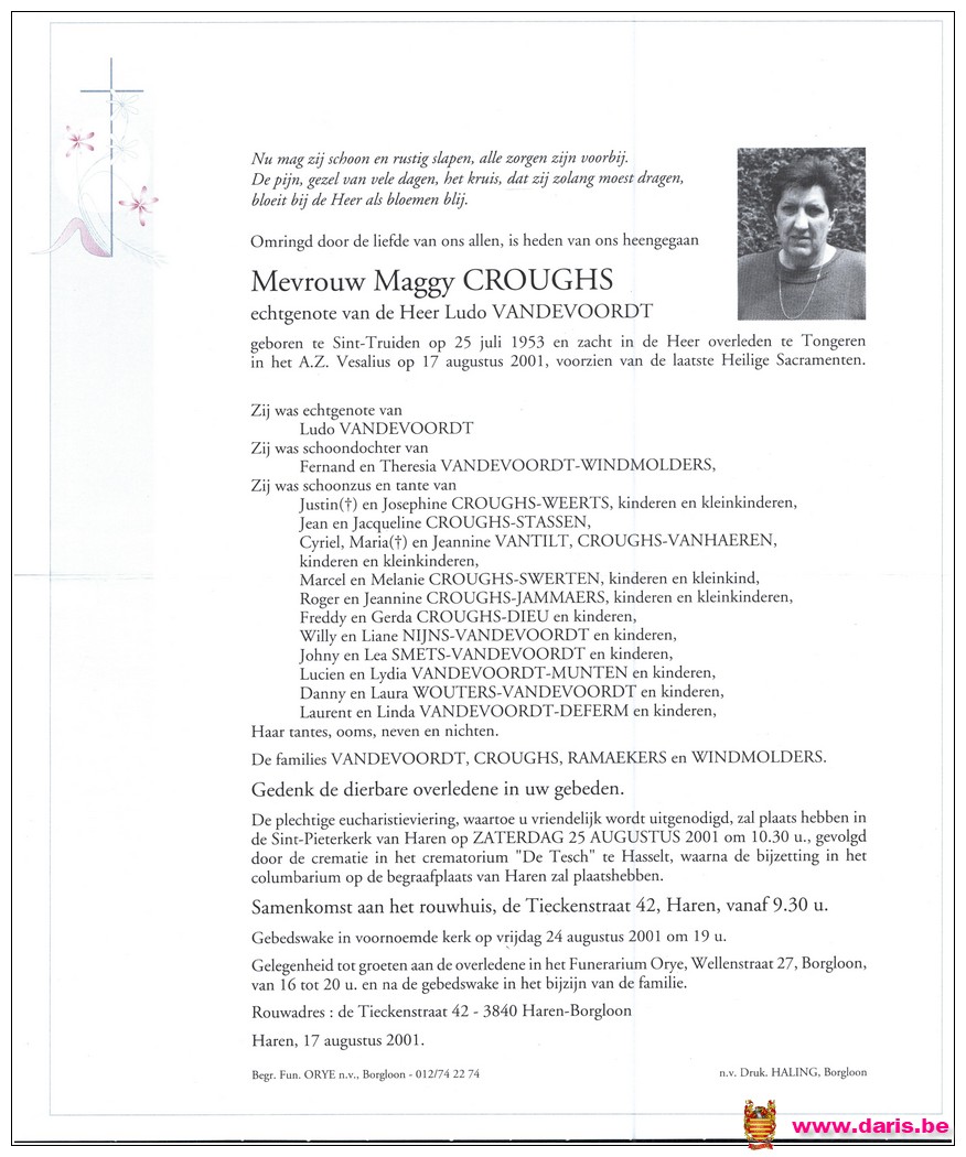 Croughs, Maggy, geboren op 25-07-1953 te Sint-Truiden, overleden op 17-08-2001 te Tongeren op 48-jarige leeftijd.
