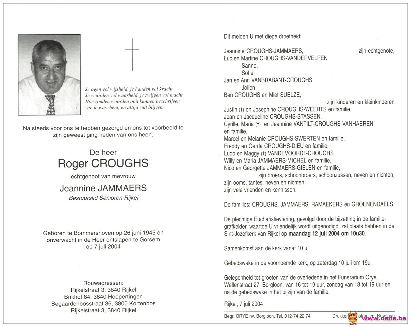 Croughs, Roger, geboren op 26-06-1945 te Bommershoven, overleden op 07-07-2004 te Gorsem op 59-jarige leeftijd.