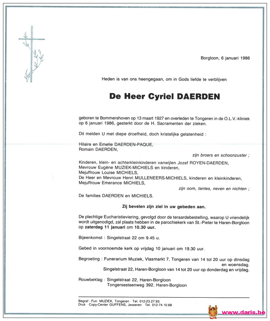 Daerden, Cyriel, geboren op 13-03-1927 te Bommershoven, overleden op 06-01-1986 te Tongeren op 58-jarige leeftijd.