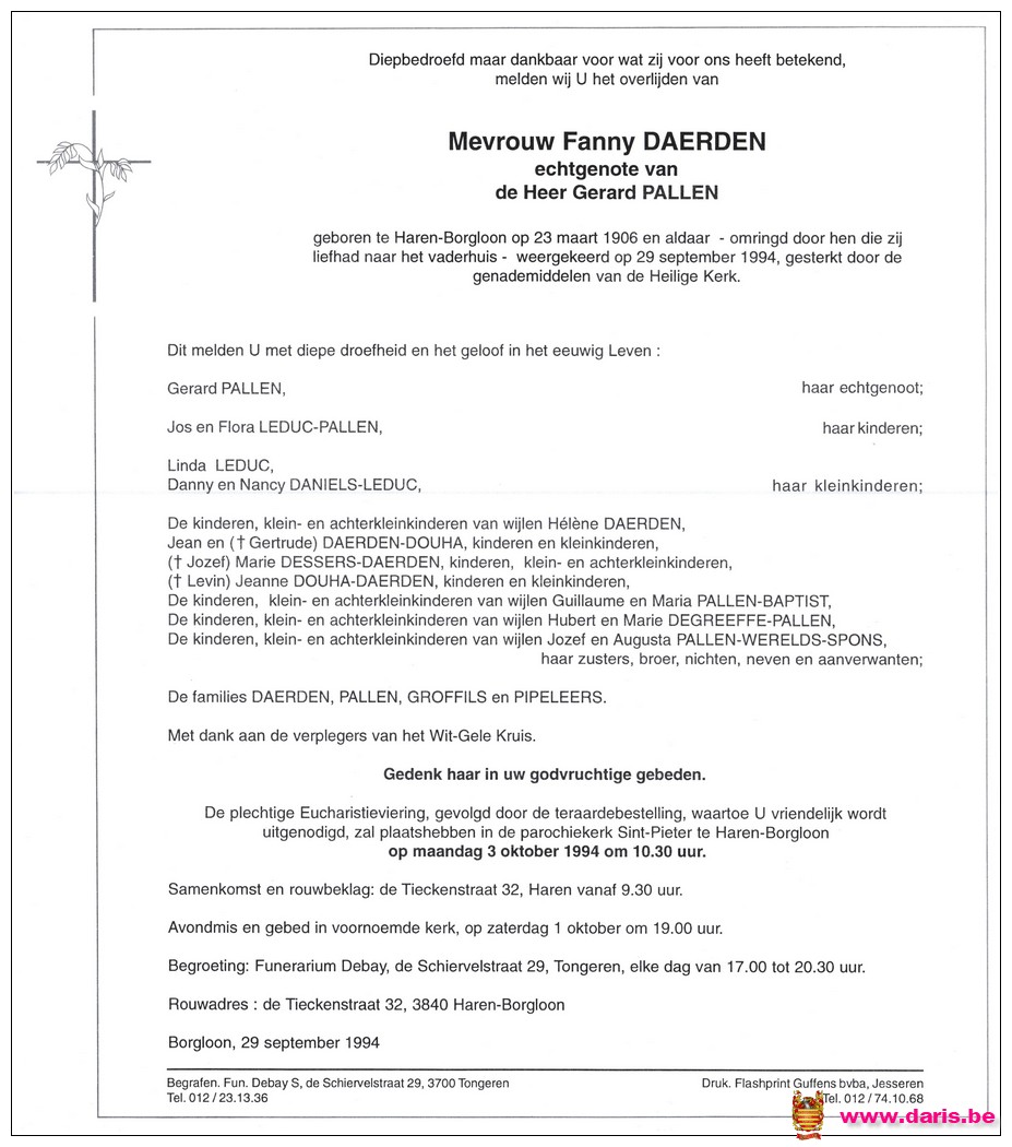Daerden, Fanny, geboren op 23-03-1906 te Bommershoven, overleden op 29-09-1994 te Haren op 88-jarige leeftijd.