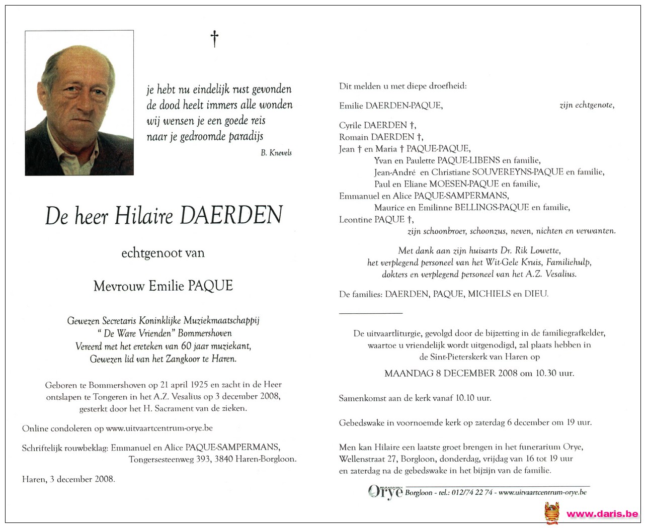 Daerden, Hilaire, geboren op 21-04-1925 te Bommershoven, overleden op 03-12-2008 te Tongeren op 83-jarige leeftijd.