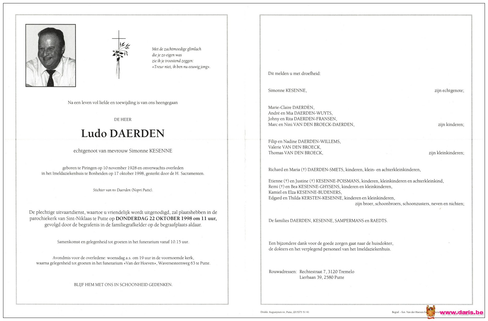 Daerden, Ludovic, geboren op 28-11-1928 te Piringen, overleden op 17-10-1998 te Bonheiden op 69-jarige leeftijd.