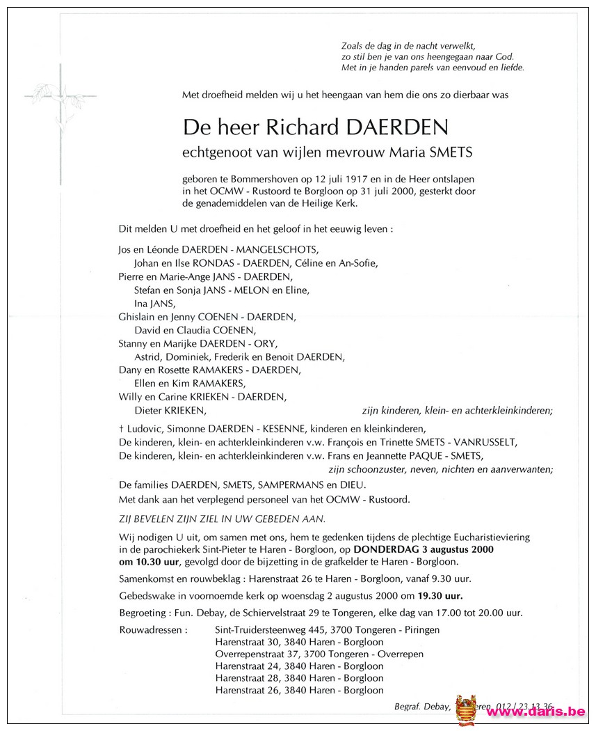 Daerden, Richard, geboren op 12-07-1917 te Bommershoven, overleden op 31-07-2000 te Borgloon op 83-jarige leeftijd.