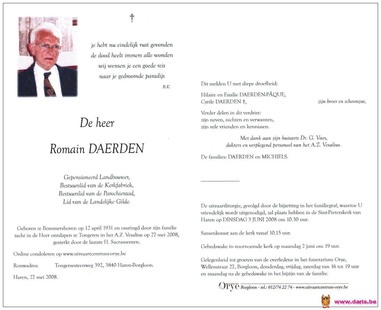 Daerden, Romain, geboren op 12-04-1931 te Bommershoven, overleden op 27-05-2008 te Tongeren op 77-jarige leeftijd.