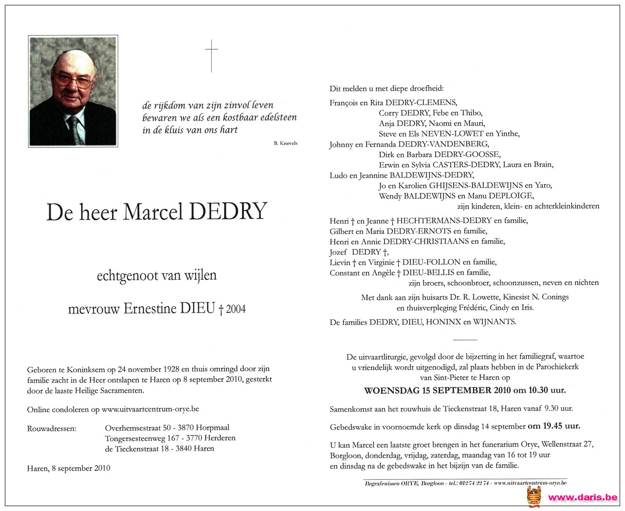 Dedry, Marcel, geboren op 24-11-1928 te Koninksem, overleden op 08-09-2010 te Haren op 81-jarige leeftijd.