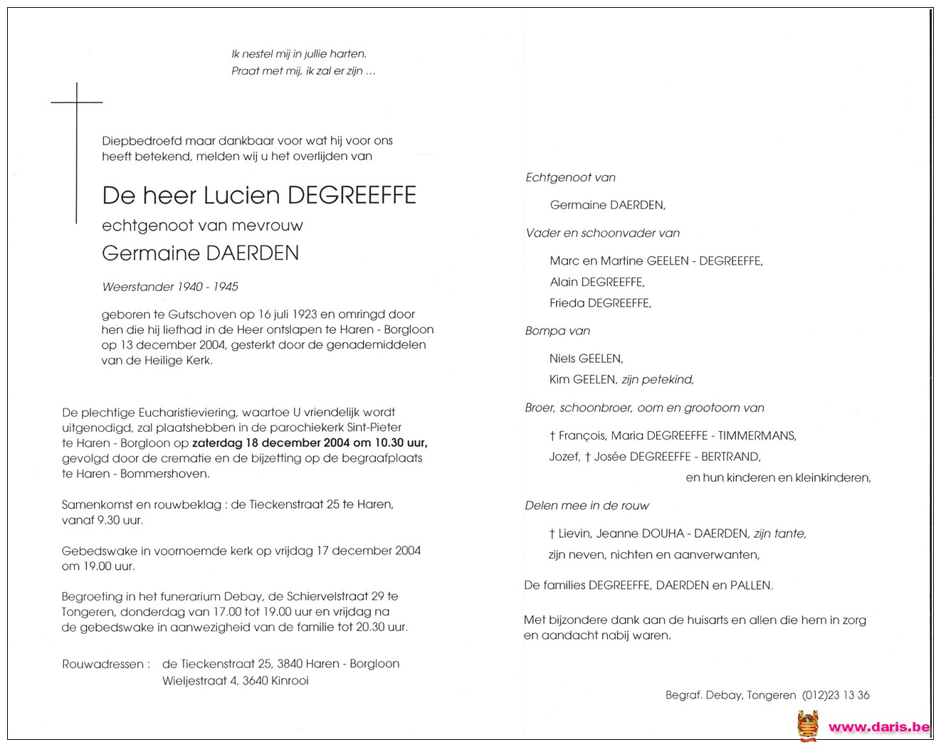 Degreeffe, Lucien, geboren op 16-07-1923 te Gutschoven, overleden op 13-12-2004 te Haren op 81-jarige leeftijd.