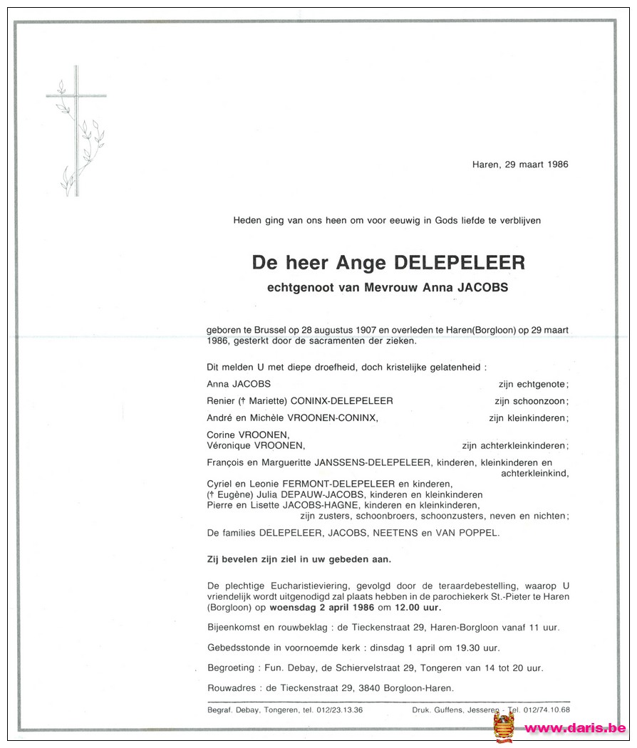 Delepeleer, Ange, geboren op 28-08-1907 te Brussel, overleden op 29-03-1986 te Haren op 78-jarige leeftijd.