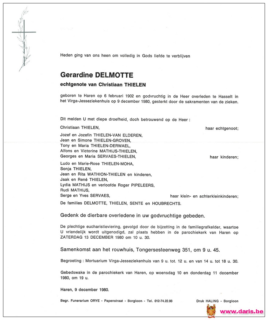 Delmotte, Gerdine, geboren op 06-02-1902 te Bommershoven, overleden op 09-12-1980 te Hasselt op 78-jarige leeftijd.