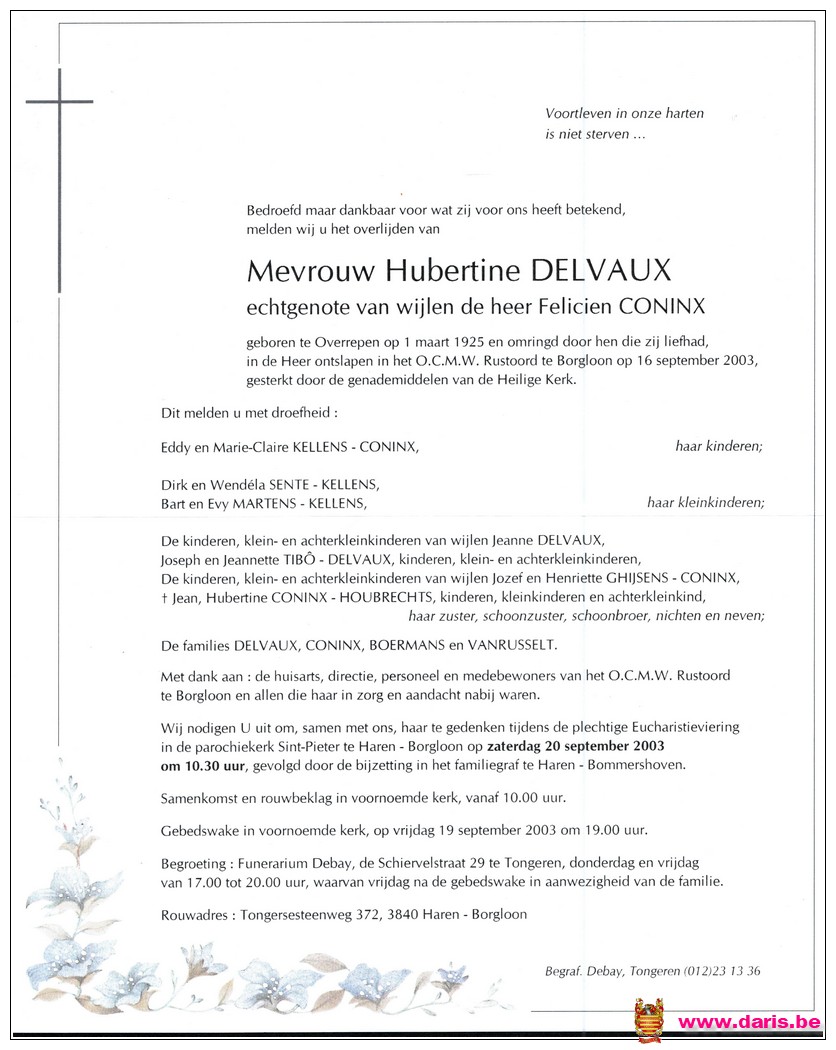 Delveau, Hubertine, geboren op 01-03-1925 te Overrepen, overleden op 16-09-2003 te Borgloon op 78-jarige leeftijd.