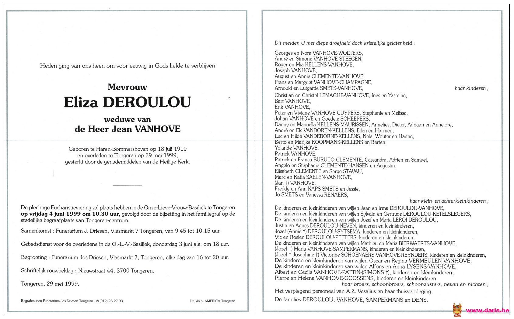 Deroulou, Eliza, geboren op 18-07-1910 te Bommershoven, overleden op 29-05-1999 te Tongeren op 88-jarige leeftijd.