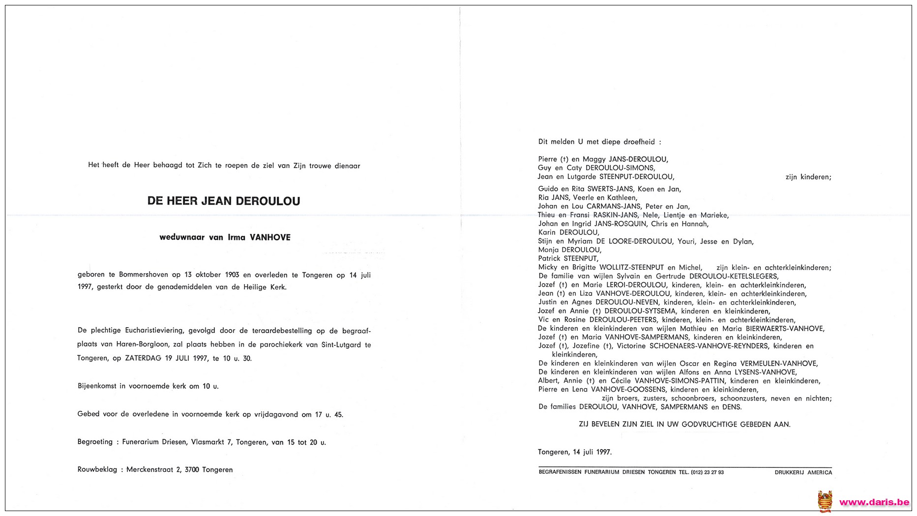 Deroulou, Jean, geboren op 13-10-1903 te Bommershoven, overleden op 14-07-1997 te Tongeren op 93-jarige leeftijd.