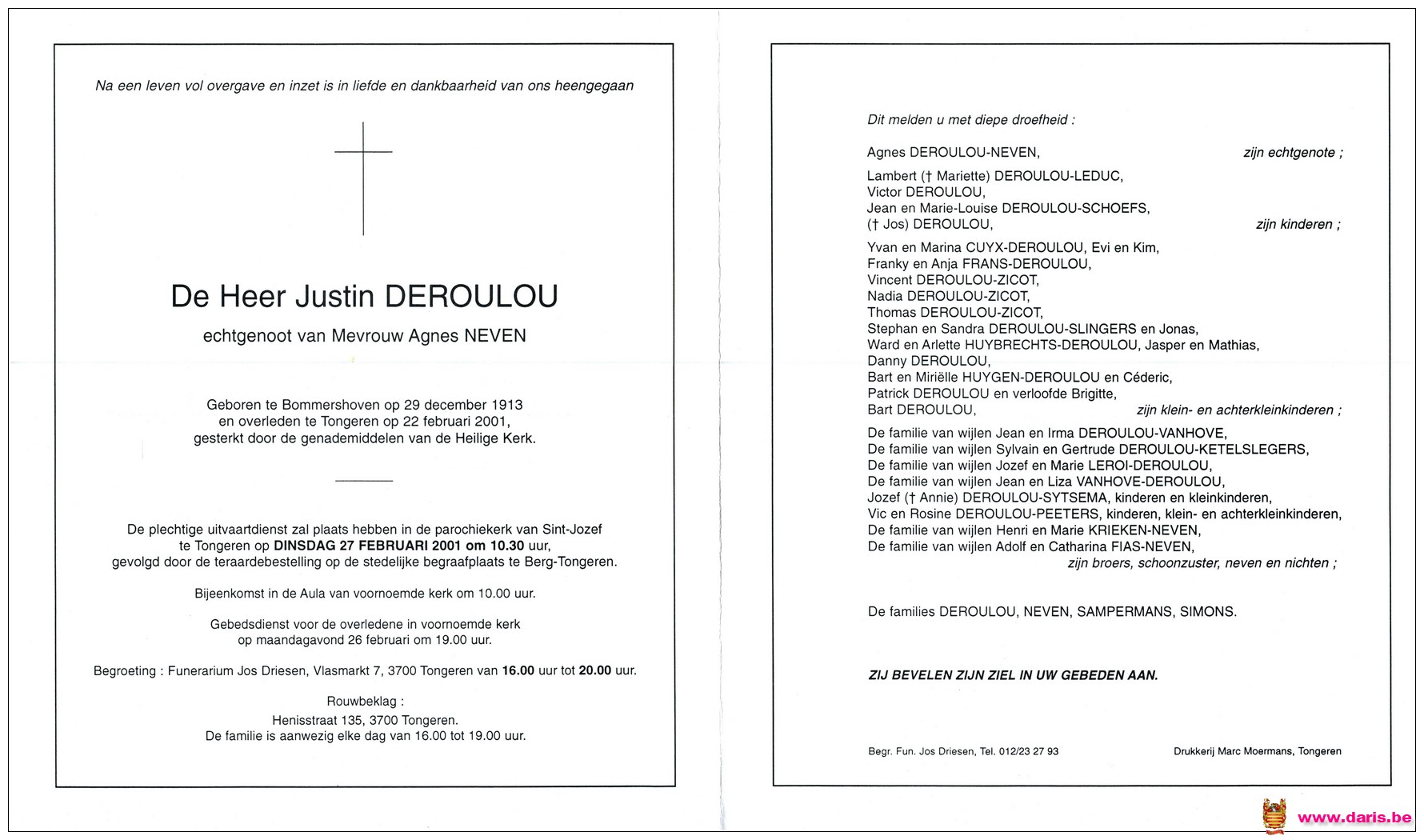 Deroulou, Justin, geboren op 29-12-1913 te Bommershoven, overleden op 22-02-2001 te Tongeren op 87-jarige leeftijd.