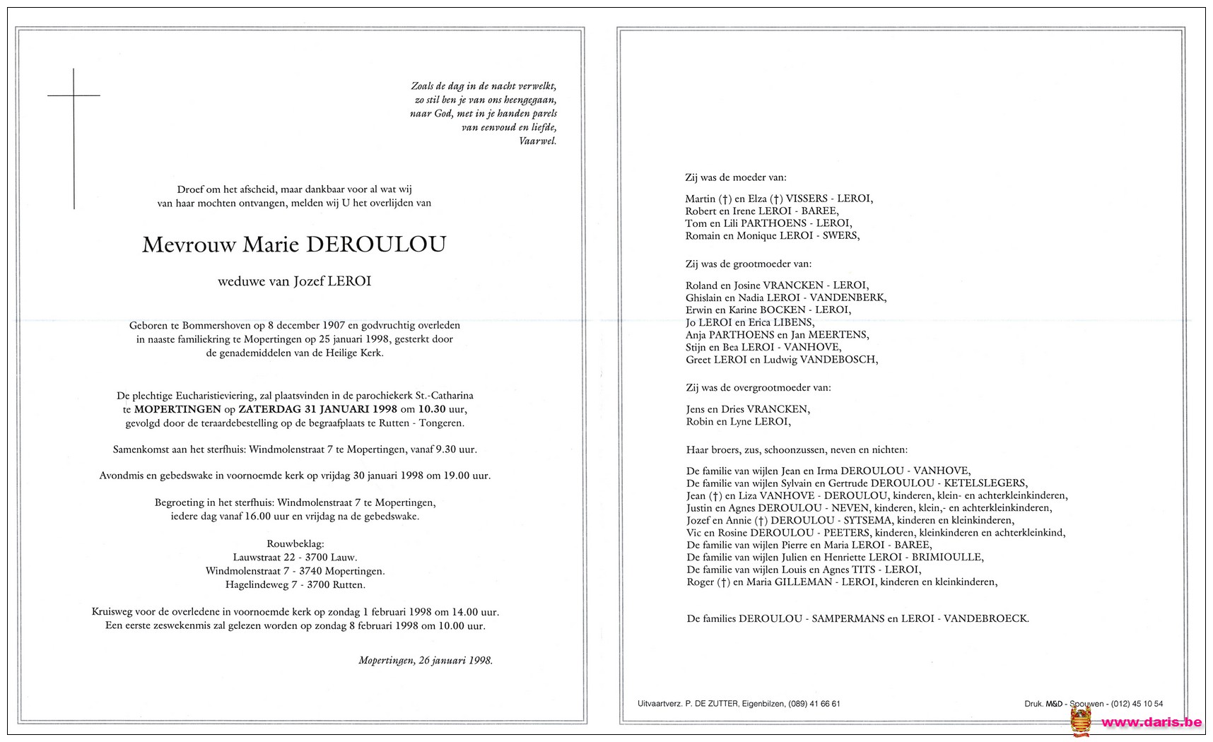 Deroulou, Marie, geboren op 08-12-1907 te Bommershoven, overleden op 25-01-1998 te Mopertingen op 90-jarige leeftijd.