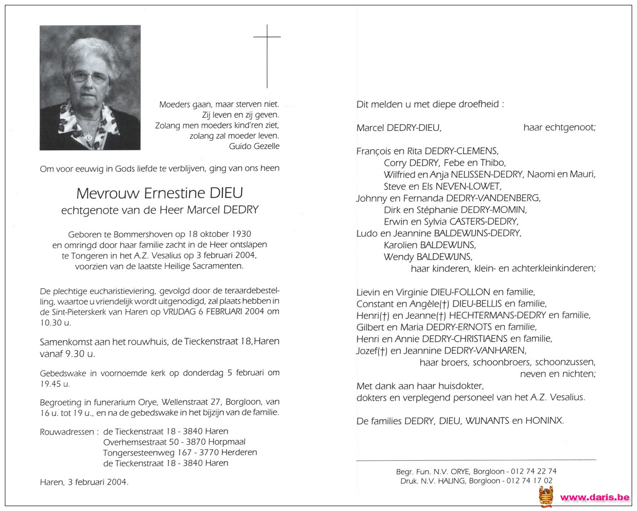Dieu, Ernestine, geboren op 18-10-1930 te Bommershoven, overleden op 03-02-2004 te Tongeren op 73-jarige leeftijd.