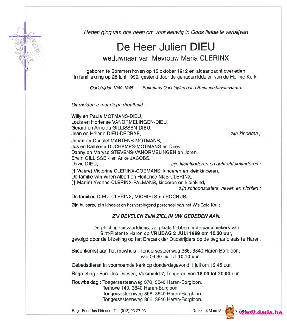 Dieu, Julien, geboren op 15-10-1912 te Bommershoven, overleden op 28-06-1999 te Haren op 86-jarige leeftijd.