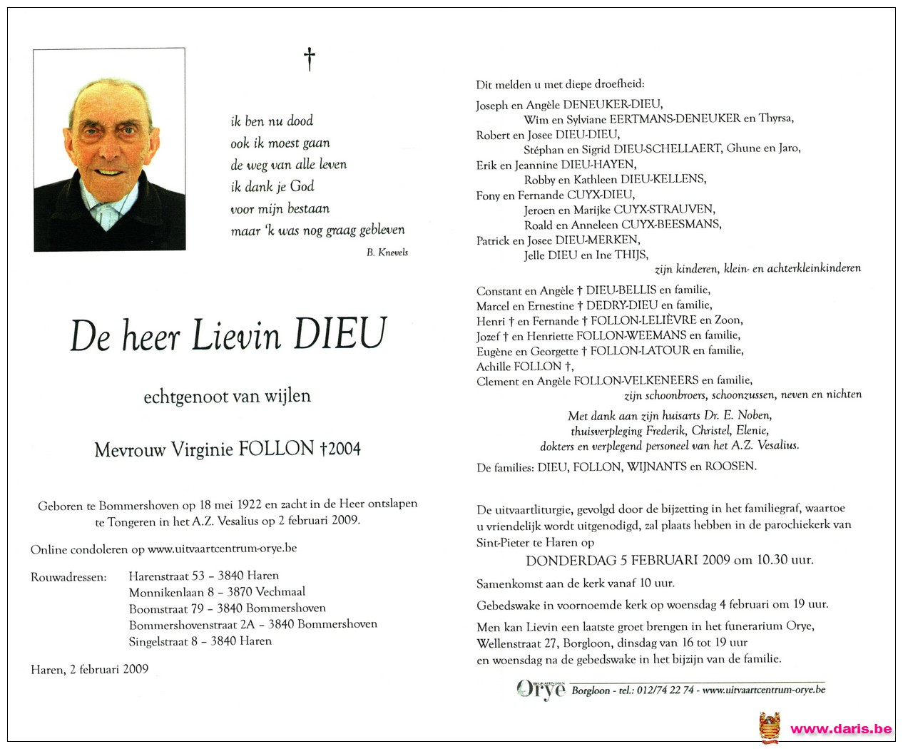 Dieu, Lievin, geboren op 18-05-1922 te Bommershoven, overleden op 02-02-2009 te Tongeren op 86-jarige leeftijd.