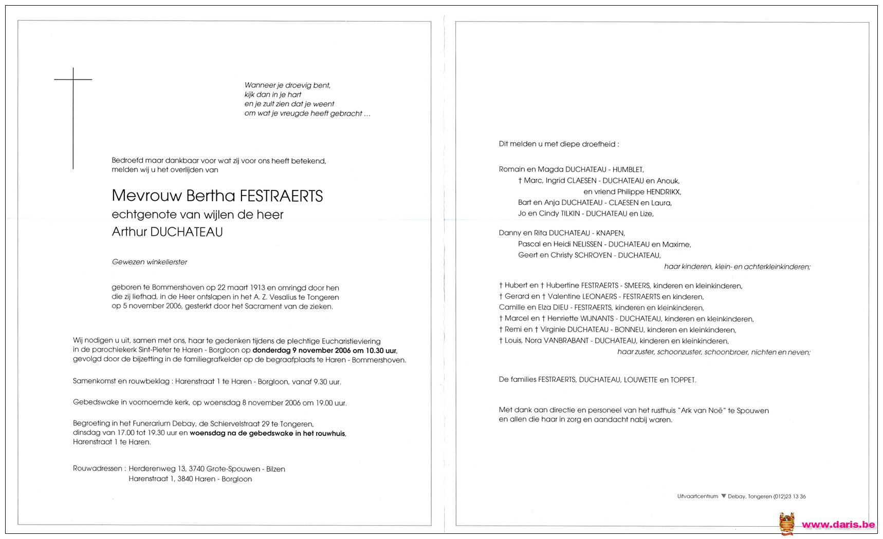 Festraerts, Bertha, geboren op 22-03-1913 te Bommershoven, overleden op 05-11-2006 te Tongeren op 93-jarige leeftijd.