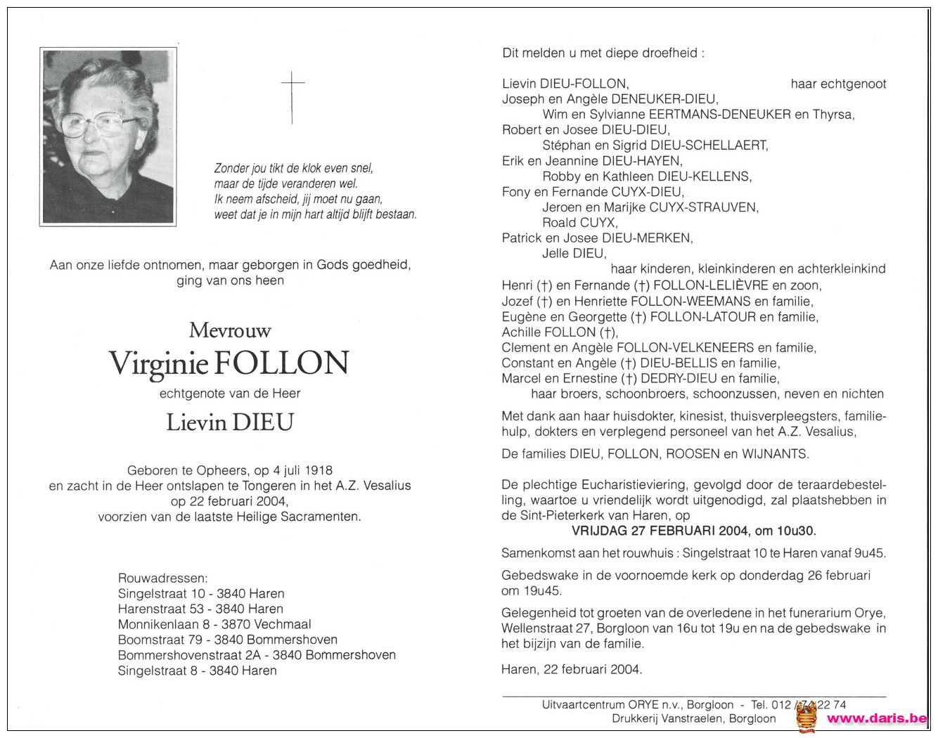 Follon, Virginie, geboren op 04-07-1918 te Opheers, overleden op 22-02-2004 te Tongeren op 85-jarige leeftijd.