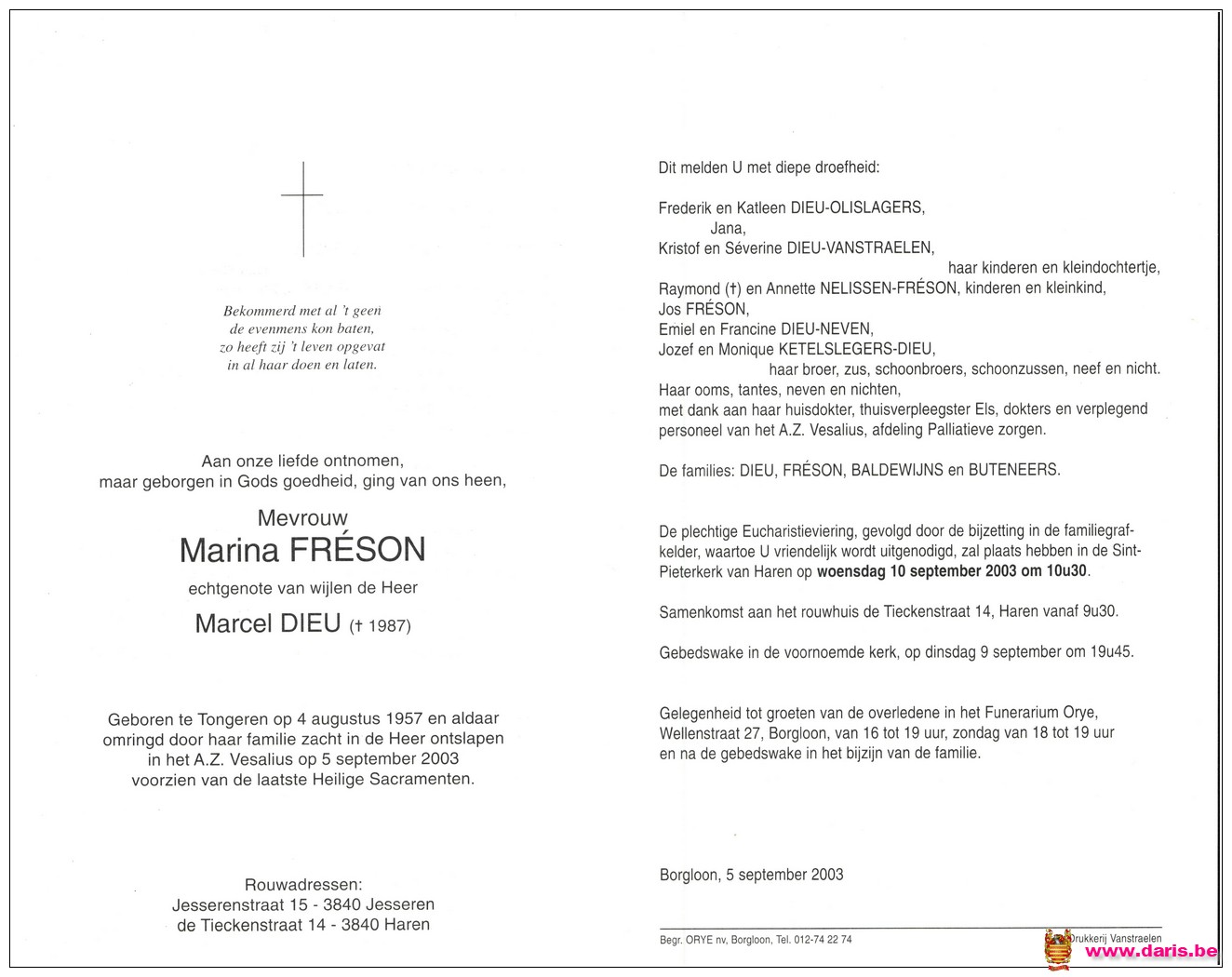 Freson, Marina, geboren op 04-08-1957 te Tongeren, overleden op 05-09-2003 te Tongeren op 46-jarige leeftijd.