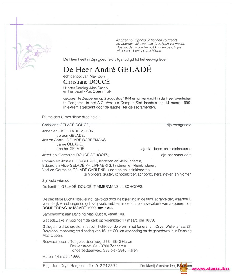 Geladé, André, geboren op 02-08-1944 te Zepperen, overleden op 14-03-1992 te Tongeren op 47-jarige leeftijd.