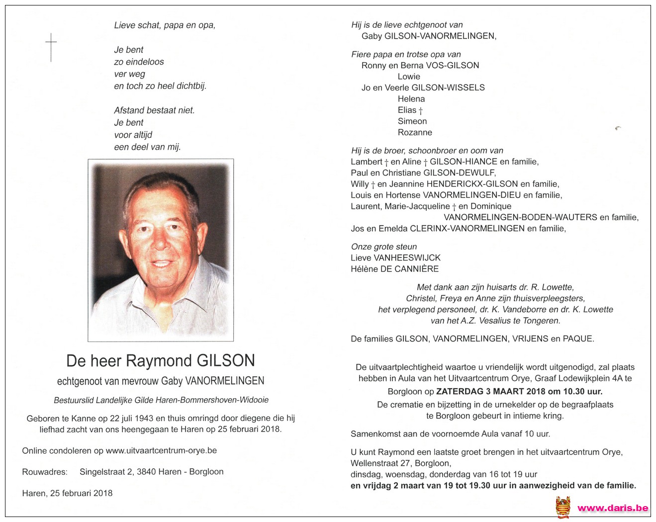 Gilson, Raymond, geboren op 22-07-1943 te Kanne, overleden op 25-02-2018 te Haren op 74-jarige leeftijd.