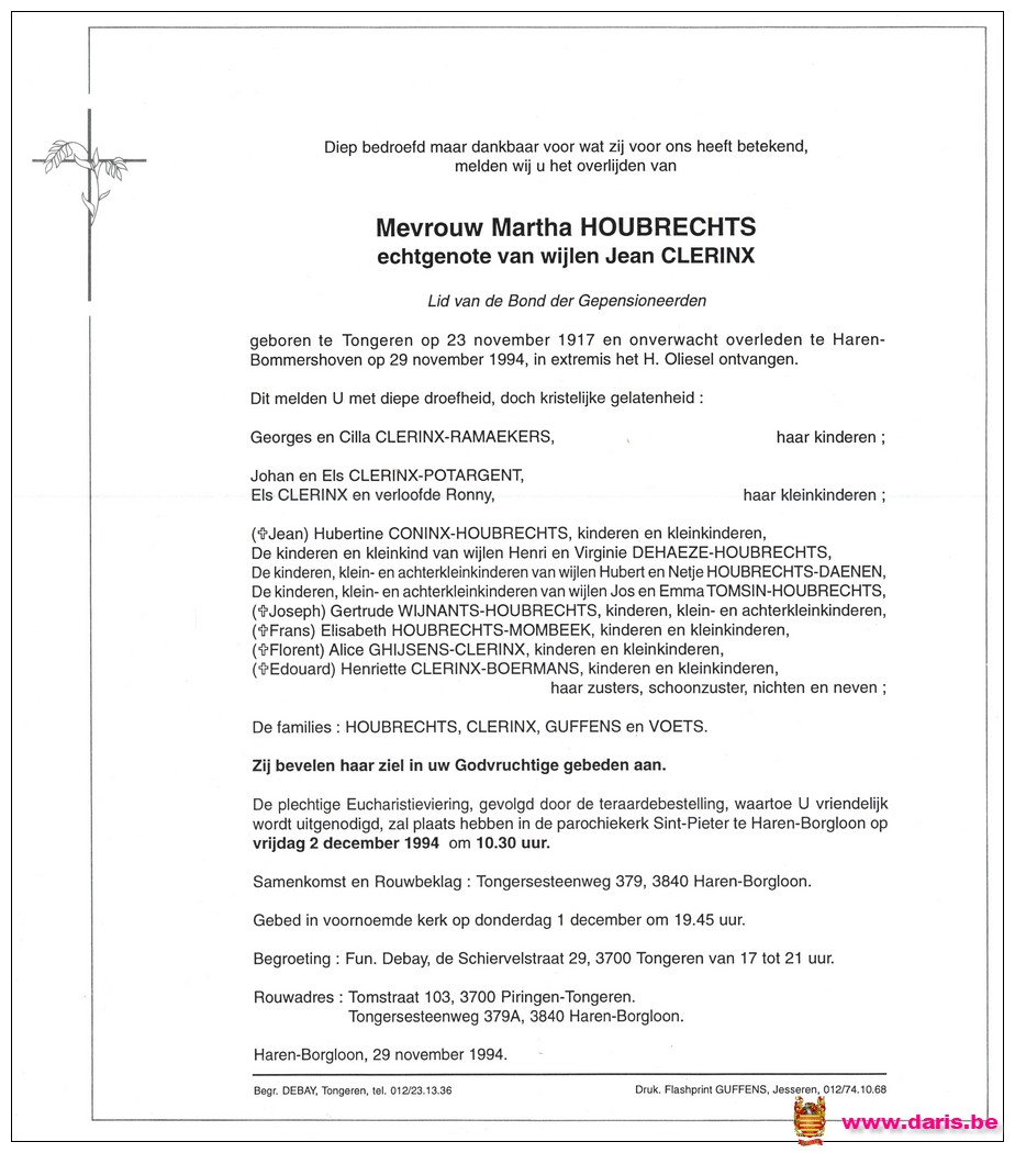 Houbrechts, Martha, geboren op 23-11-1917 te Tongeren, overleden op 29-11-1994 te Haren op 77-jarige leeftijd.