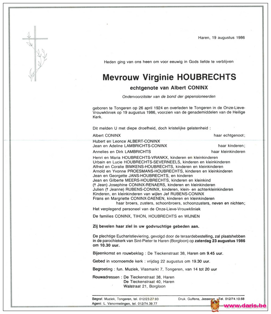 Houbrechts, Virginie, geboren op 26-04-1924 te Tongeren, overleden op 19-08-1986 te Tongeren op 62-jarige leeftijd.
