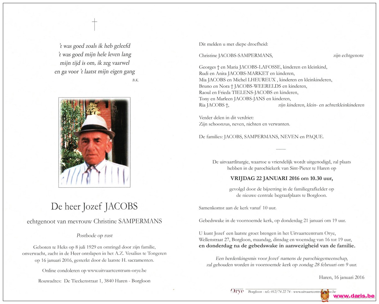Jacobs, Jozef, geboren op 08-07-1929 te Heks, overleden op 16-01-2016 te Tongeren op 86-jarige leeftijd.