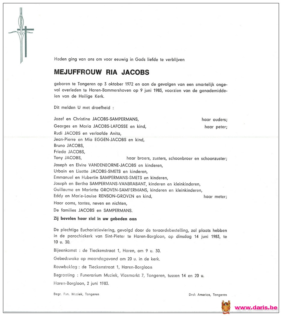 Jacobs, Ria, geboren op 03-10-1972 te Tongeren, overleden op 09-06-1983 te Haren op 10-jarige leeftijd.
