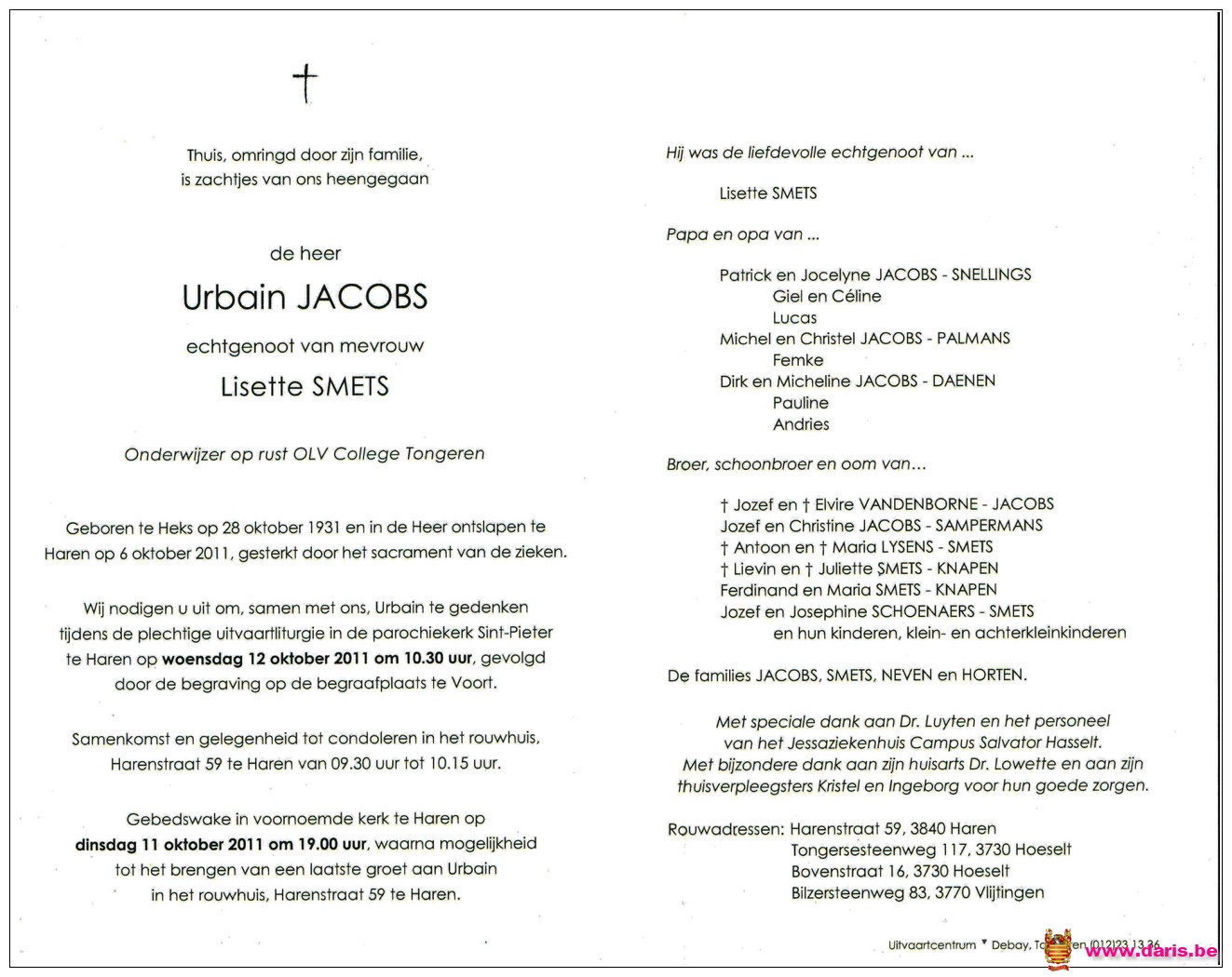 Jacobs, Urbain, geboren op 28-10-1931 te Heks, overleden op 06-10-2011 te Haren op 79-jarige leeftijd.