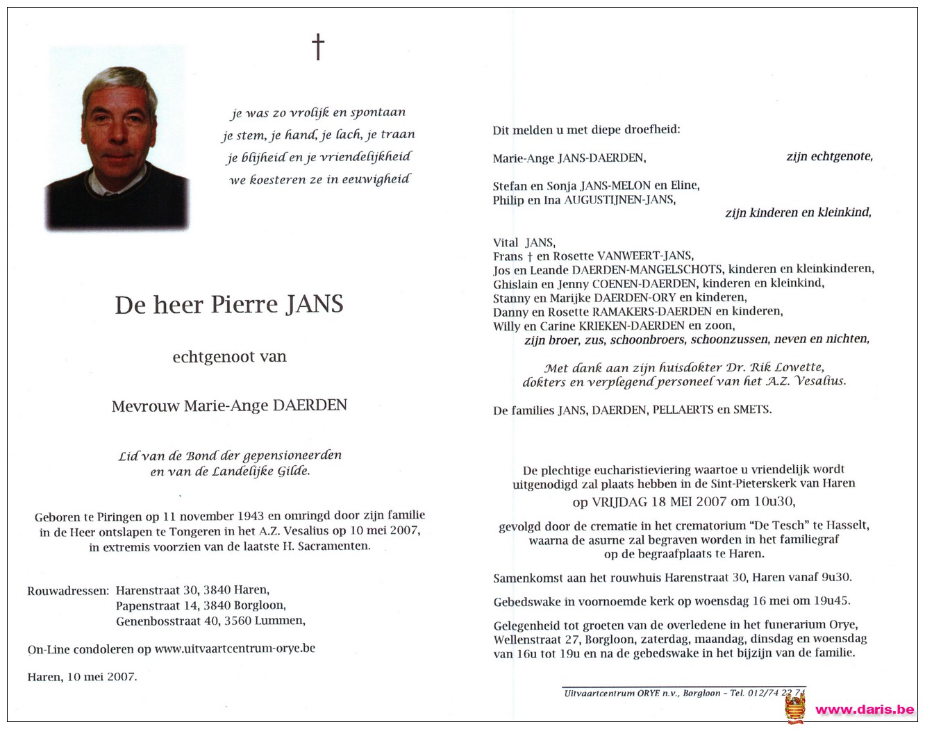 Jans, Pierre, geboren op 11-11-1943 te Piringen, overleden op 10-05-2007 te Tongeren op 63-jarige leeftijd.
