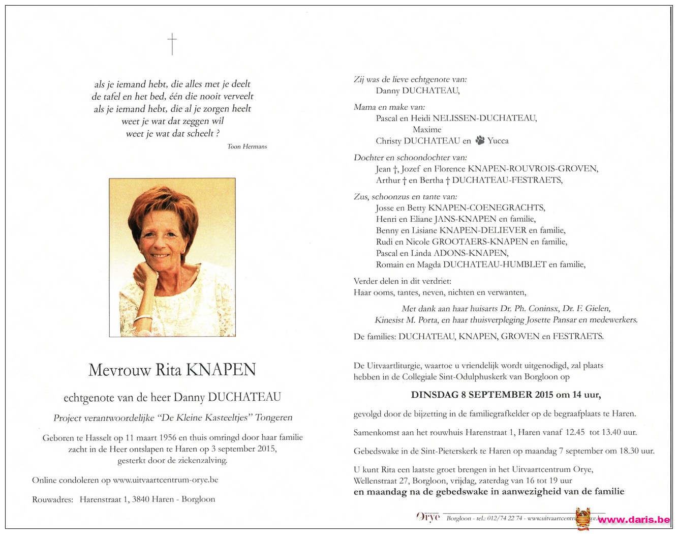 Knapen, Rita, geboren op 11-03-1956 te Hasselt, overleden op 03-09-2015 te Haren op 59-jarige leeftijd.