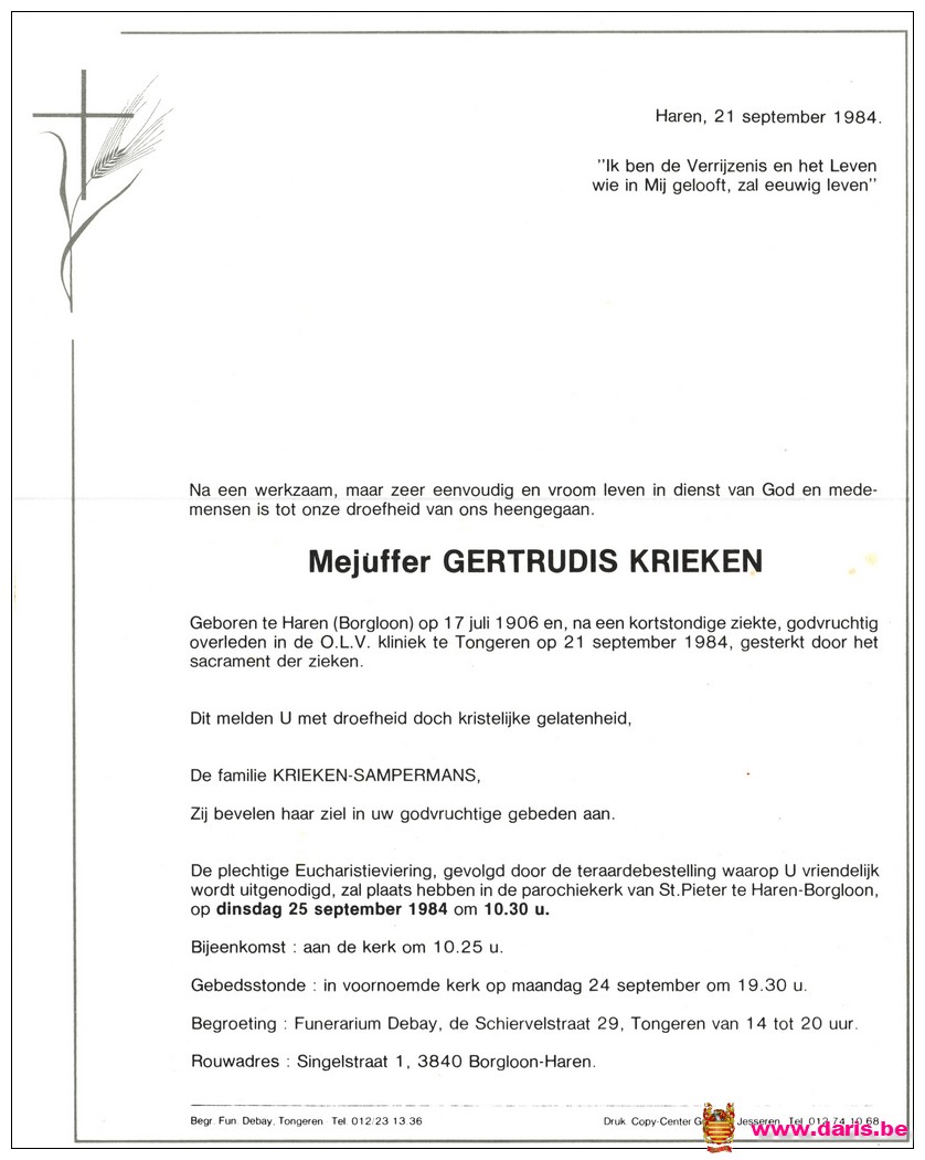 Krieken, Gertrude, geboren op 17-07-1906 te Bommershoven, overleden op 21-09-1984 te Tongeren op 78-jarige leeftijd.