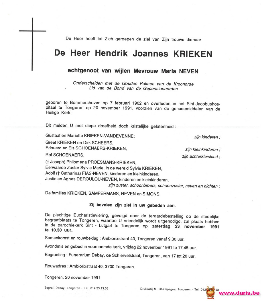 Krieken, Henri, geboren op 07-02-1902 te Bommershoven, overleden op 20-11-1991 te Tongeren op 89-jarige leeftijd.