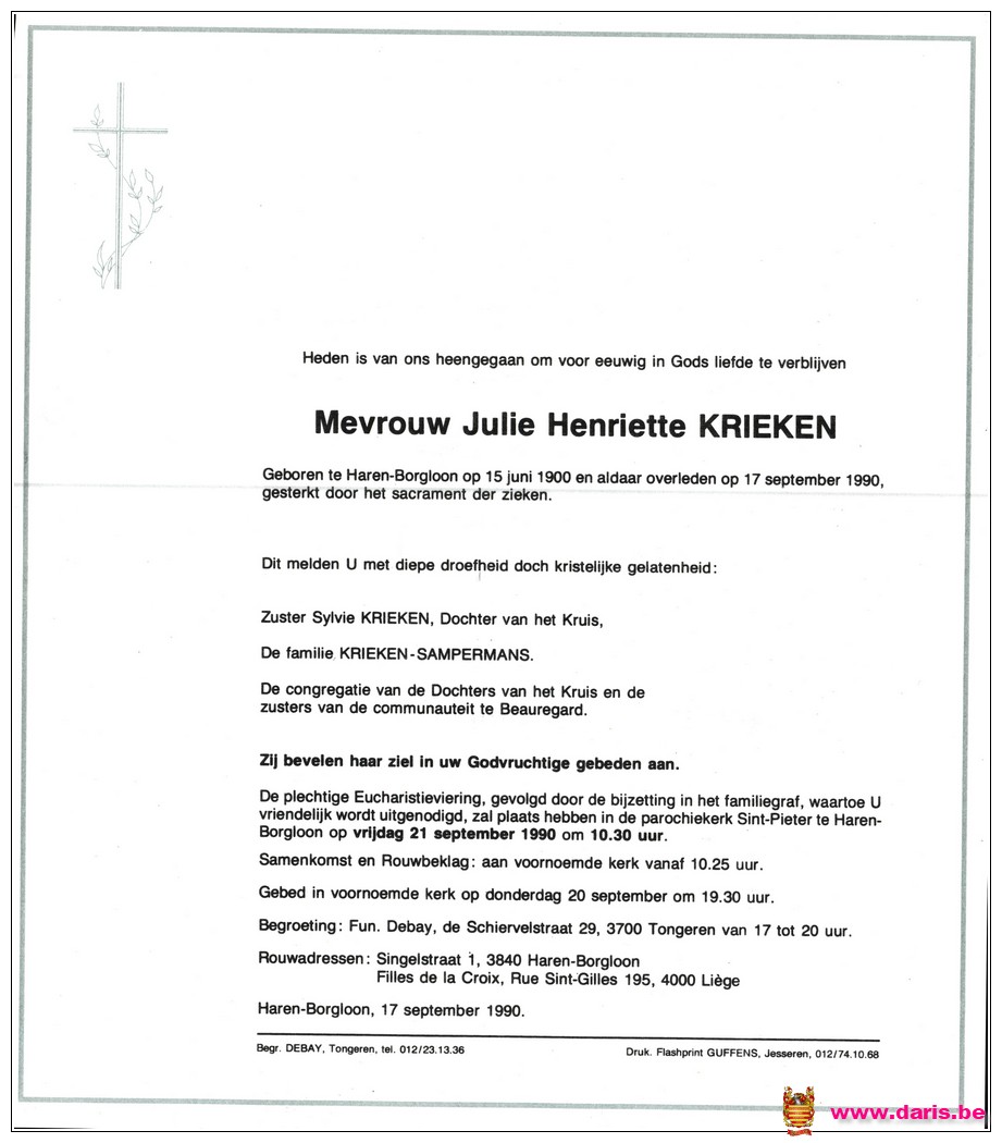 Krieken, Julie, geboren op 15-06-1900 te Bommershoven, overleden op 17-09-1990 te Haren op 90-jarige leeftijd.