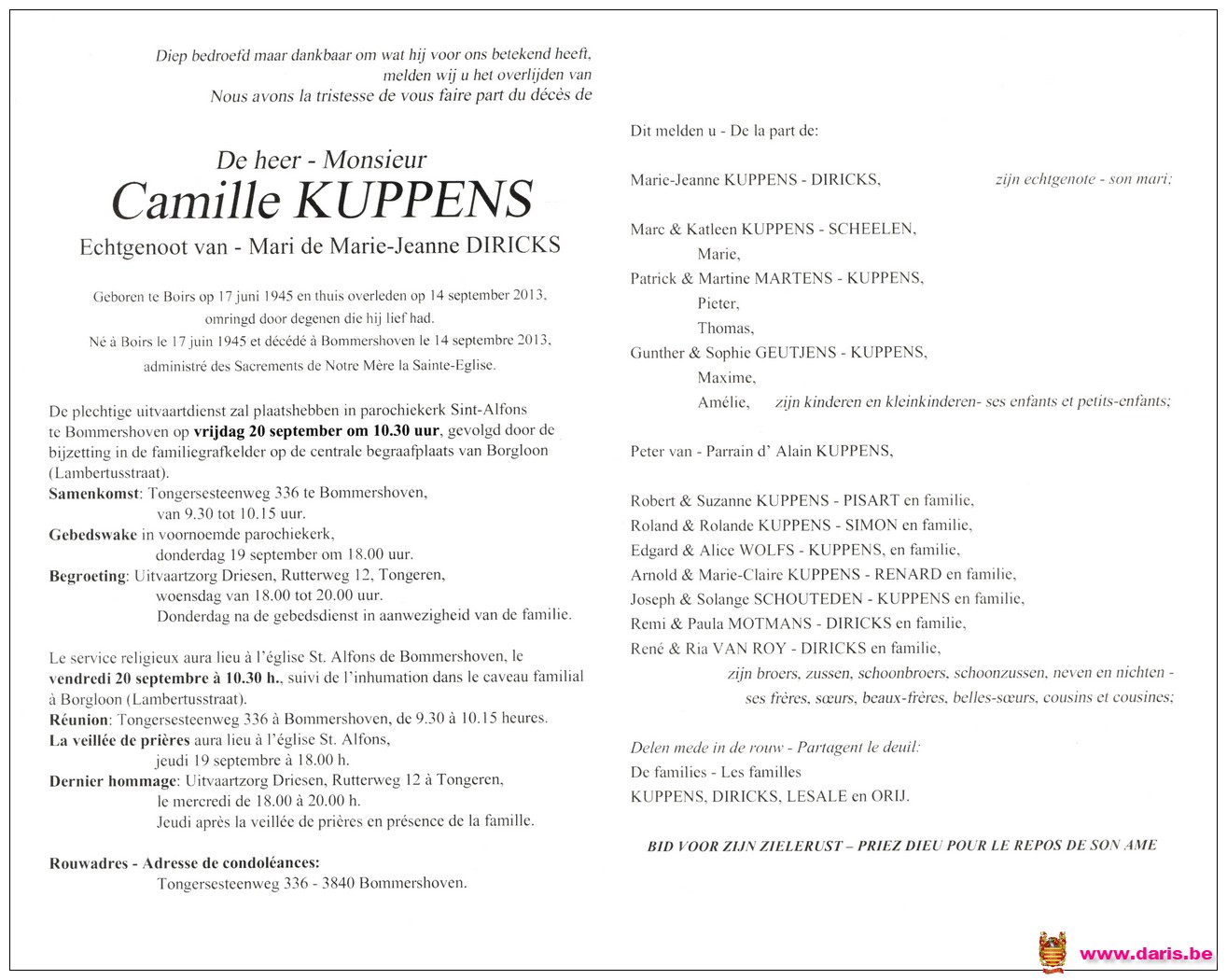Kuppens, Camille, geboren op 17-06-1945 te Boirs, overleden op 14-09-2013 te Haren op 68-jarige leeftijd.