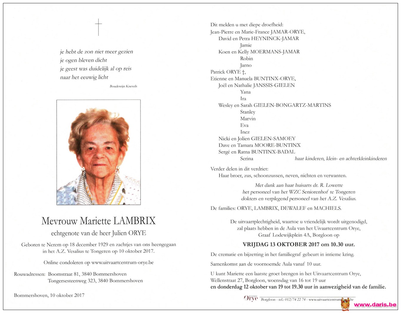 Lambrix, Mariette, geboren op 18-12-1929 te Nerem, overleden op 10-10-2017 te Tongeren op 87-jarige leeftijd.